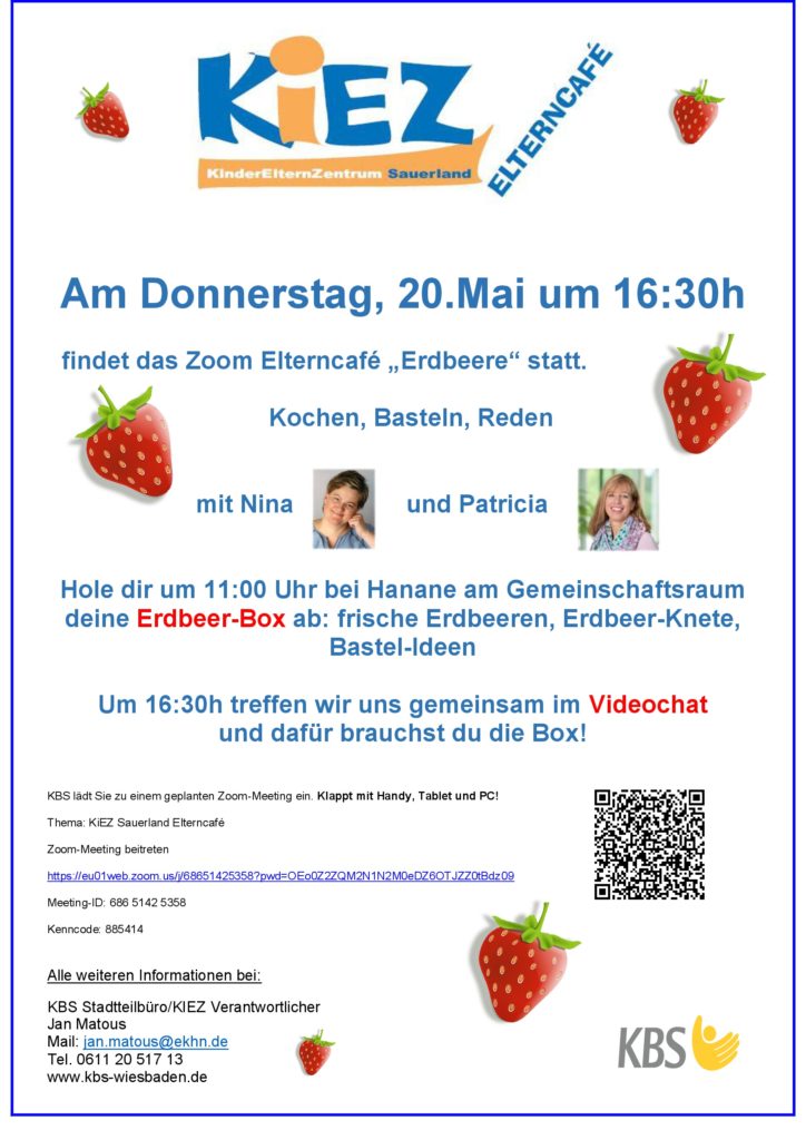 Donnerstag, 20.Mai um 16:30h ist unser Zoom Elterncafe. Wir essen frische Erdbeeren, basteln, erzählen…. Kindern sind herzlich willkommen. Es soll laut und fröhlich sein!