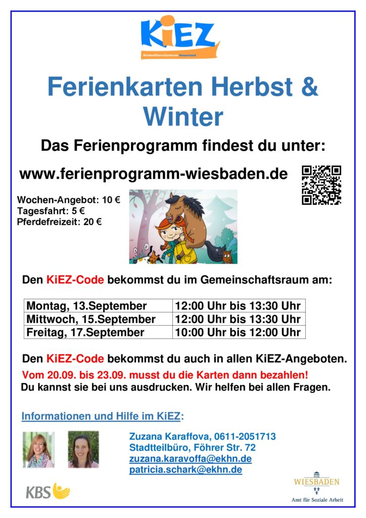 Ab sofort bis 17.September kannst du dir bei uns den KiEZ Code für das Ferienprogramm holen. So sind alle Angebote günstiger für dich. Du musst dich registrieren, eine Wunschliste machen und dann bezahlen. Wir helfen dir gerne! Komm vorbei, rufe an oder schicke uns eine Mail.