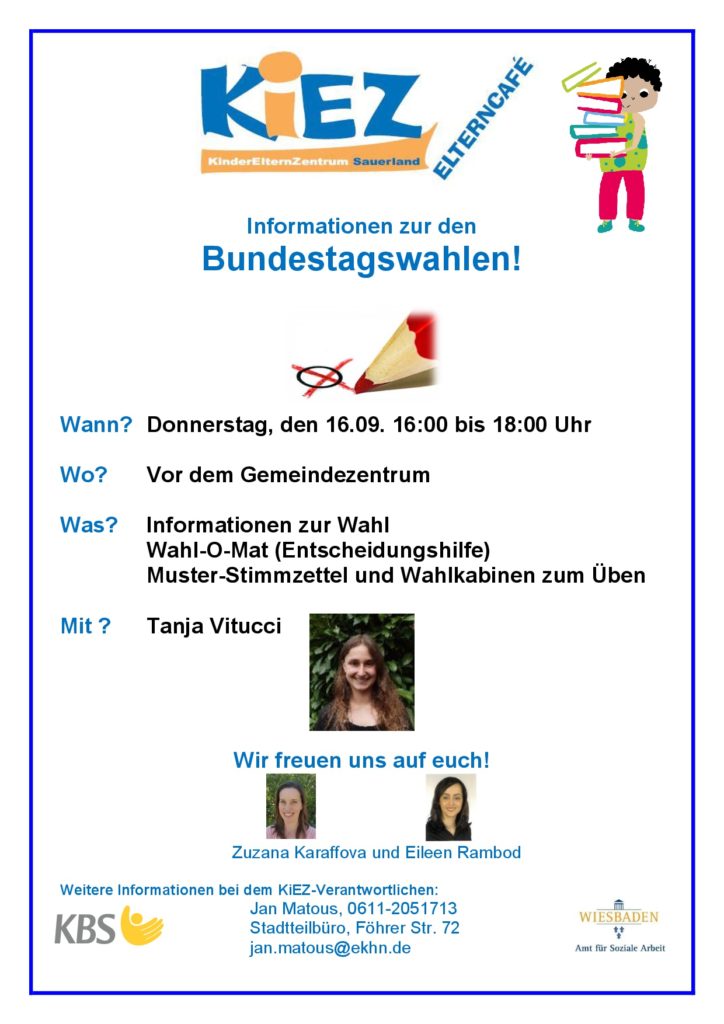 Am 16. September um 16:00 Uhr findet das „Fit für die Schule 2.0 Themencafé“ statt. Unser Gast Tanja Vitucci bringt Informationen zu den Bundestagswahlen mit. Wir lernen den Wahl-O-Mat kennen. In den Wahlkabinen üben wir mit Muster-Stimmzetteln. Wir freuen uns auf euch!