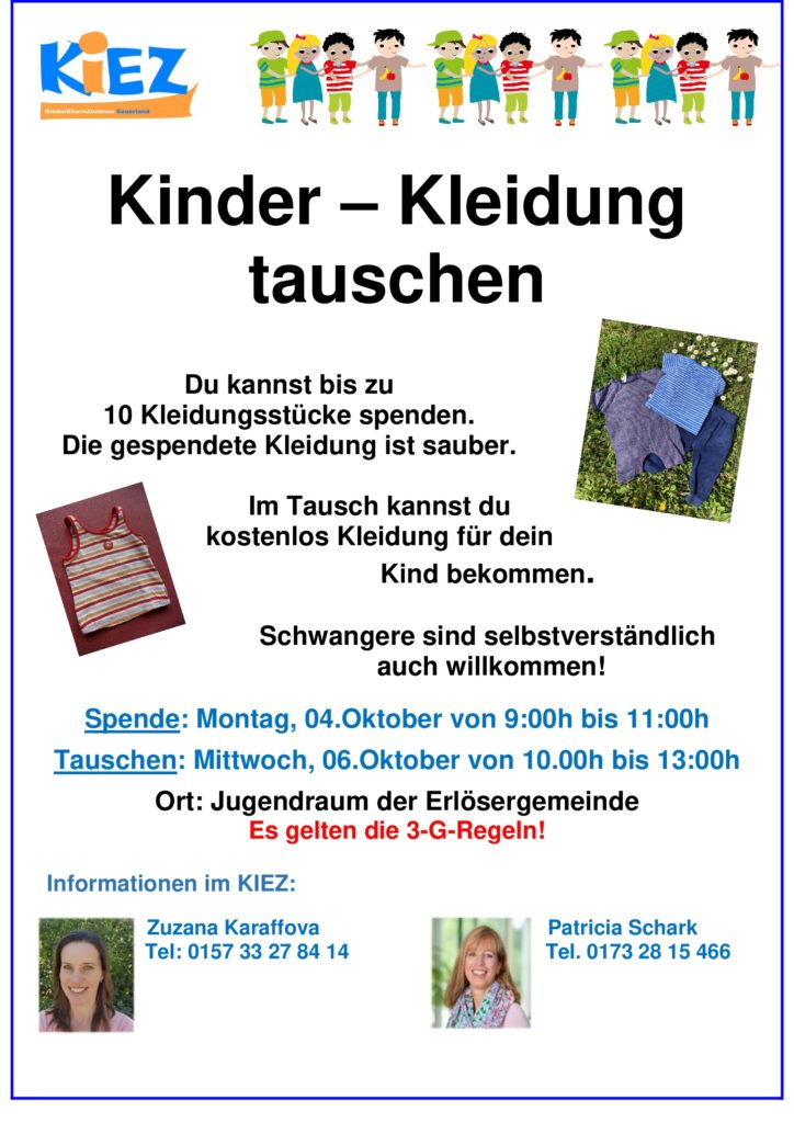Am Montag, 04.Oktober ab 9:00h bringst du uns saubere Kinder-Kleidung. Am Mittwoch, 06.Oktober ab 10:00h kannst du dir andere Kinder-Kleidung mitnehmen. Alle Kleidungsstücke sind eine Spende! Die Tauschbörse ist im oder vor dem Jugendraum an der Gemeinde.