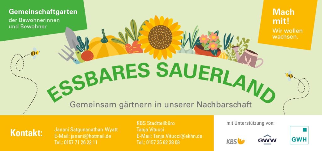 Heute möchte sich Janani vom „Essbaren Sauerland“ mit euch gemeinsam die Hände schmutzig machen. Treffpunkt ist um 16:00 Uhr auf dem Marktplatz am Gemeinschaftsraum des KBS.