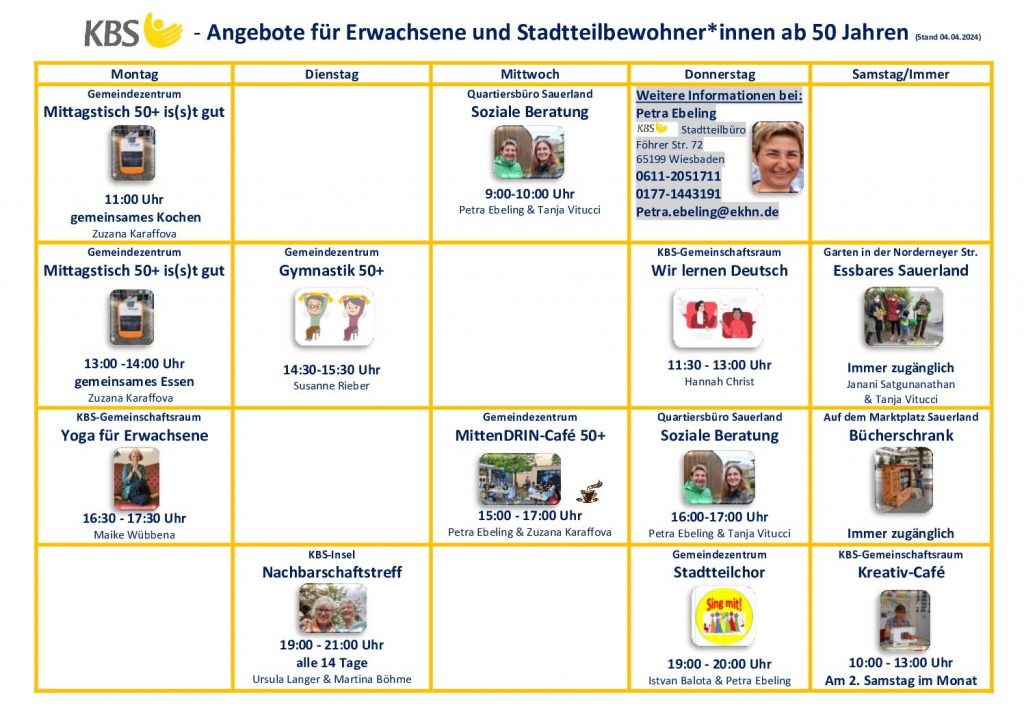 50+ Angebote Die 50+-Angebote sind für alle Stadtteilbewohner*innen ab 50 Jahren. 50+-Angebote Kontakt Petra Ebeling0611 / 20517-110177 / 1443191E-Mail: petra.ebeling[ät]ekhn.de mit freundlicher Unterstützung